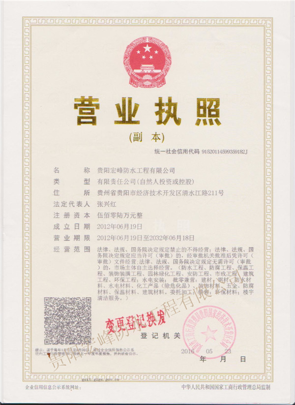宏峰公司屬國(guó)家防水防腐保溫工程專業(yè)承包貳級(jí)資質(zhì)企業(yè),經(jīng)貴州省住房和城鄉(xiāng)建設(shè)廳考核合格