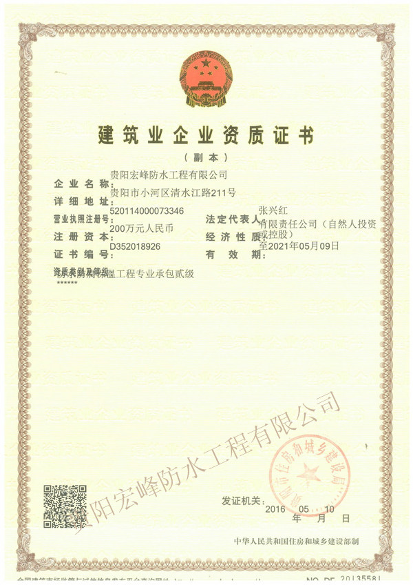 宏峰公司屬國家防水防腐保溫工程專業(yè)承包貳級資質(zhì)企業(yè),經(jīng)貴州省住房和城鄉(xiāng)建設(shè)廳考核合格